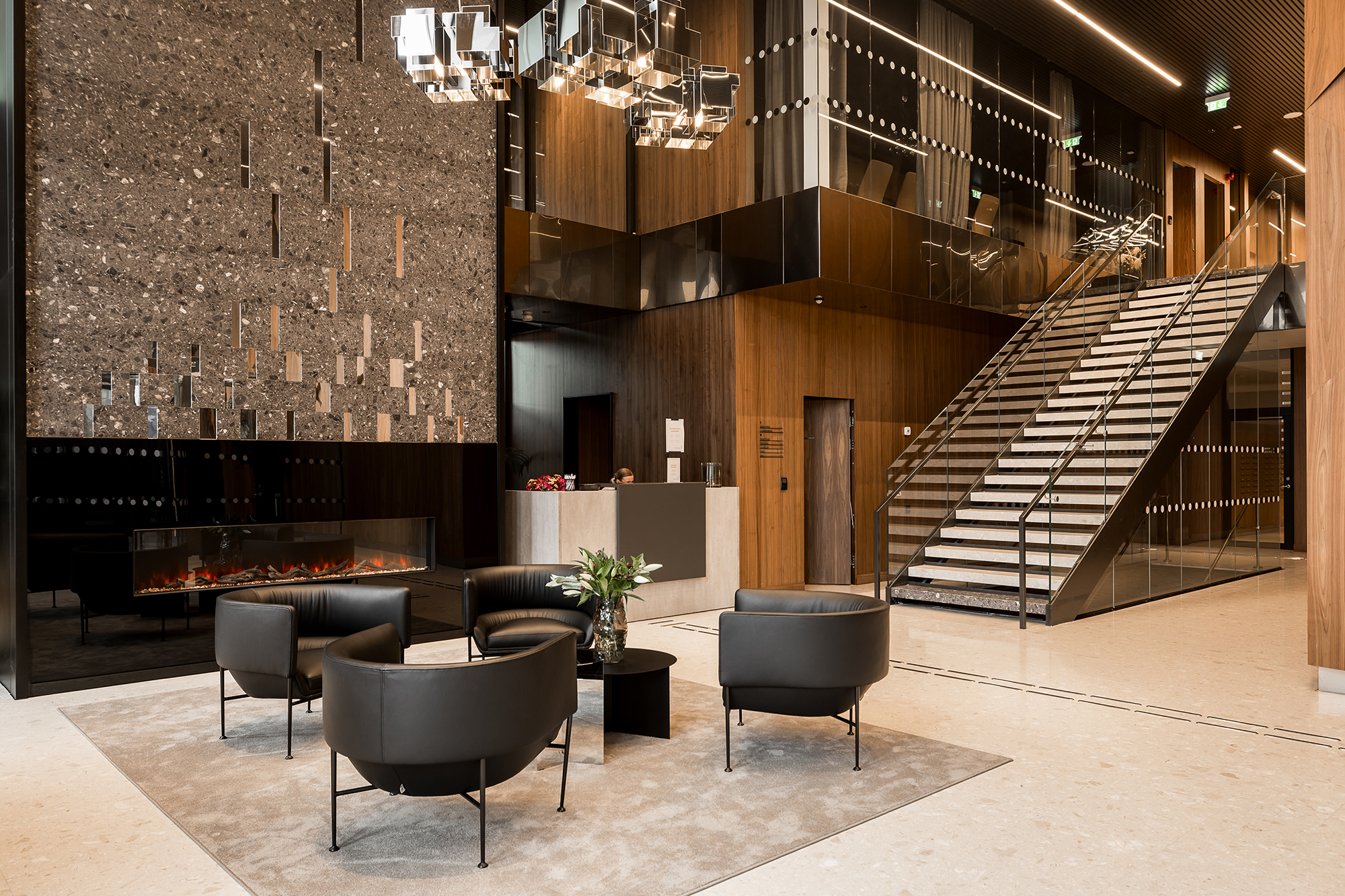 I entrén finns en lobby med lounge och bemannad reception. För olika typer av sammankomster finns flera bokningsbara utrymmen, som konferensrum, biosalong och aktivitetsrum.