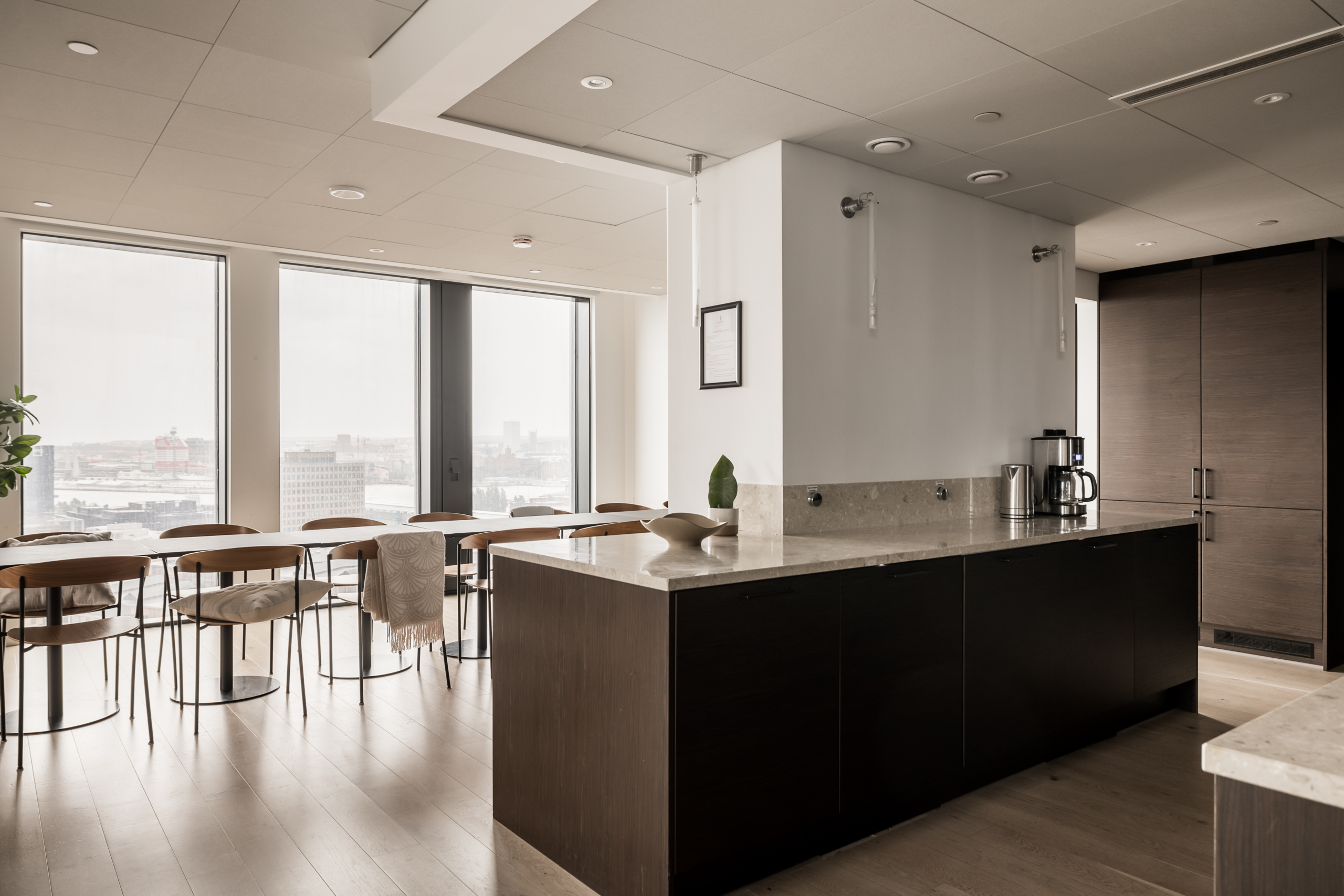 På våning 15 finns en gemensam takterrass med trädgård och ytor för både umgänge och avkoppling. I direkt anslutning till terrassen ligger även en bokningsbar lokal med kök och matplats, anpassad för större sällskap.
